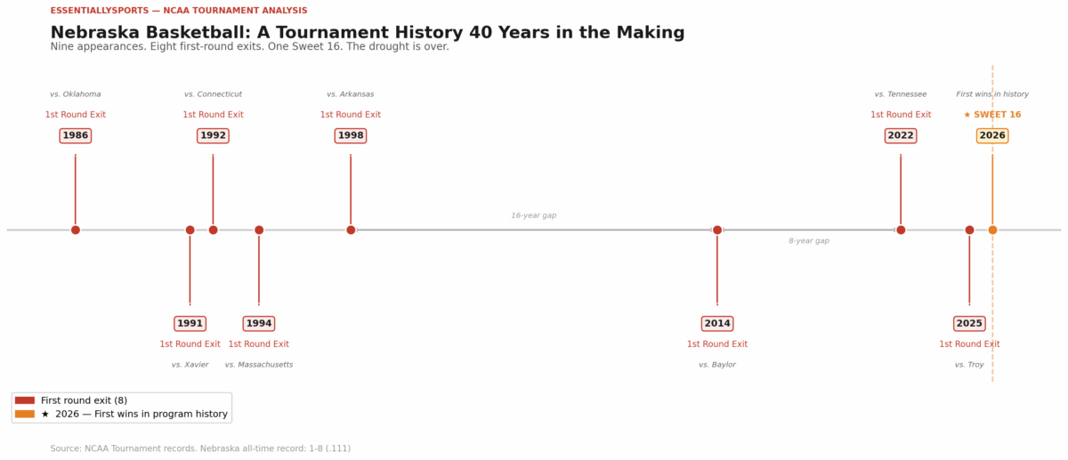 Up until Round 1 of this year’s tournament, Nebraska was the only Power Conference program that had never won a March Madness contest.