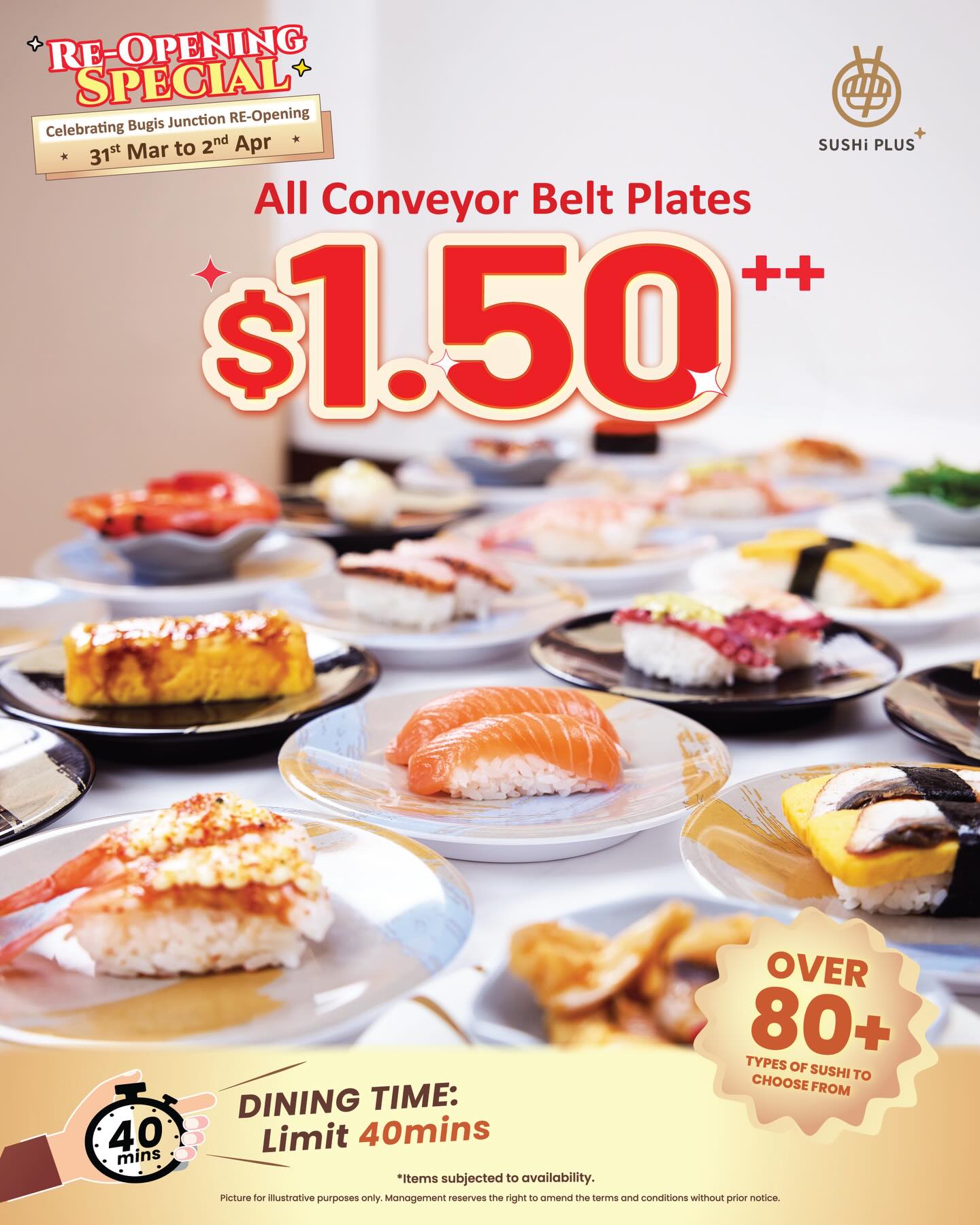 📅 31 March – 2 April 2026 💰 All plates at $1.50++ 🍣 80+ varieties available ⏱ 40-minute dining limit 📍 Sushi Plus, Bugis Junction